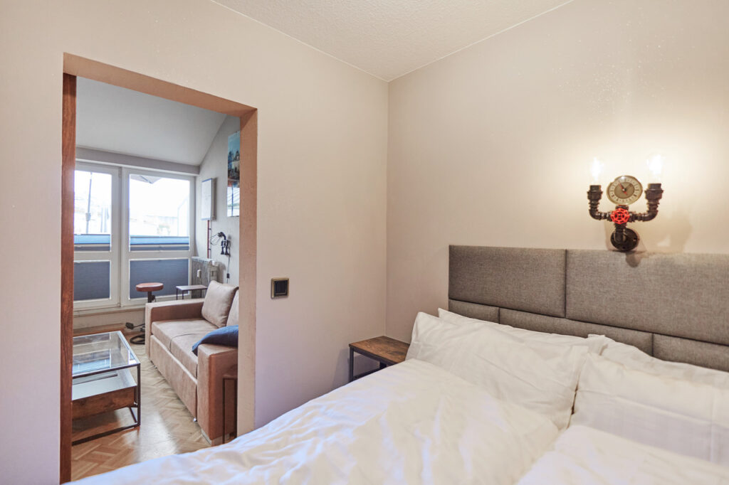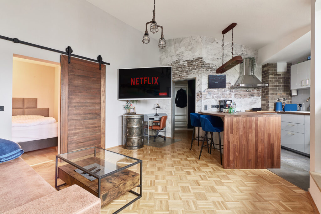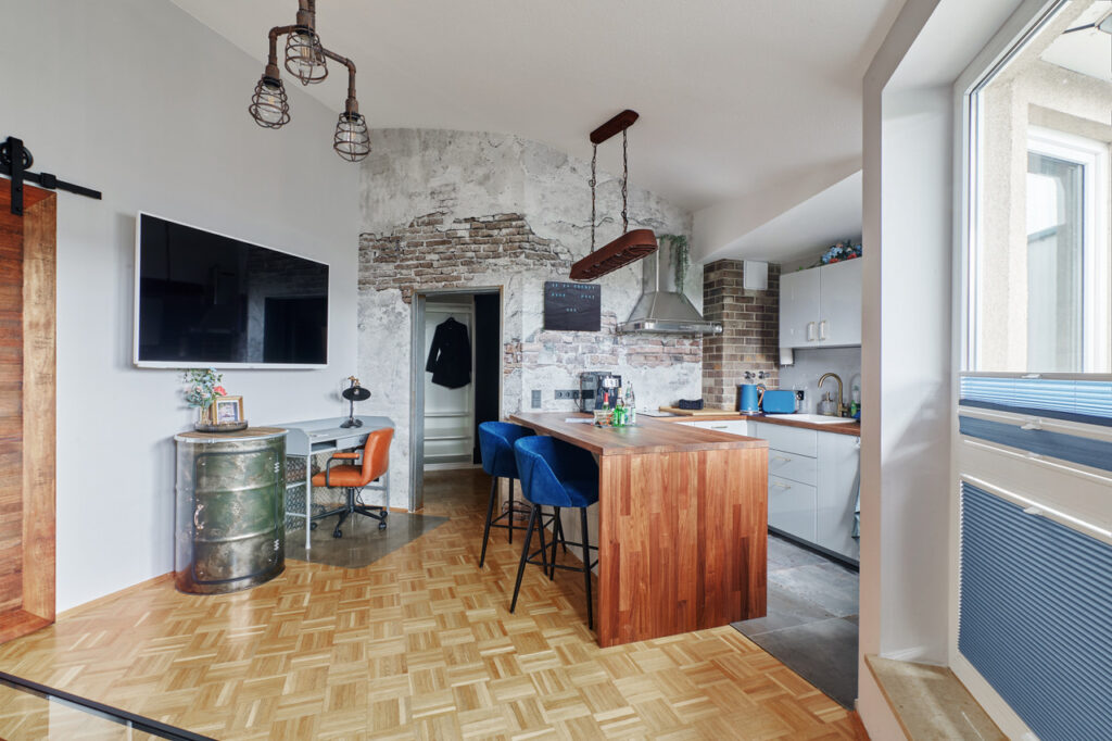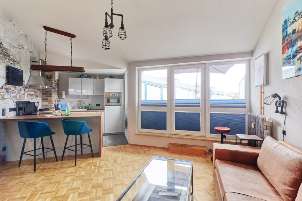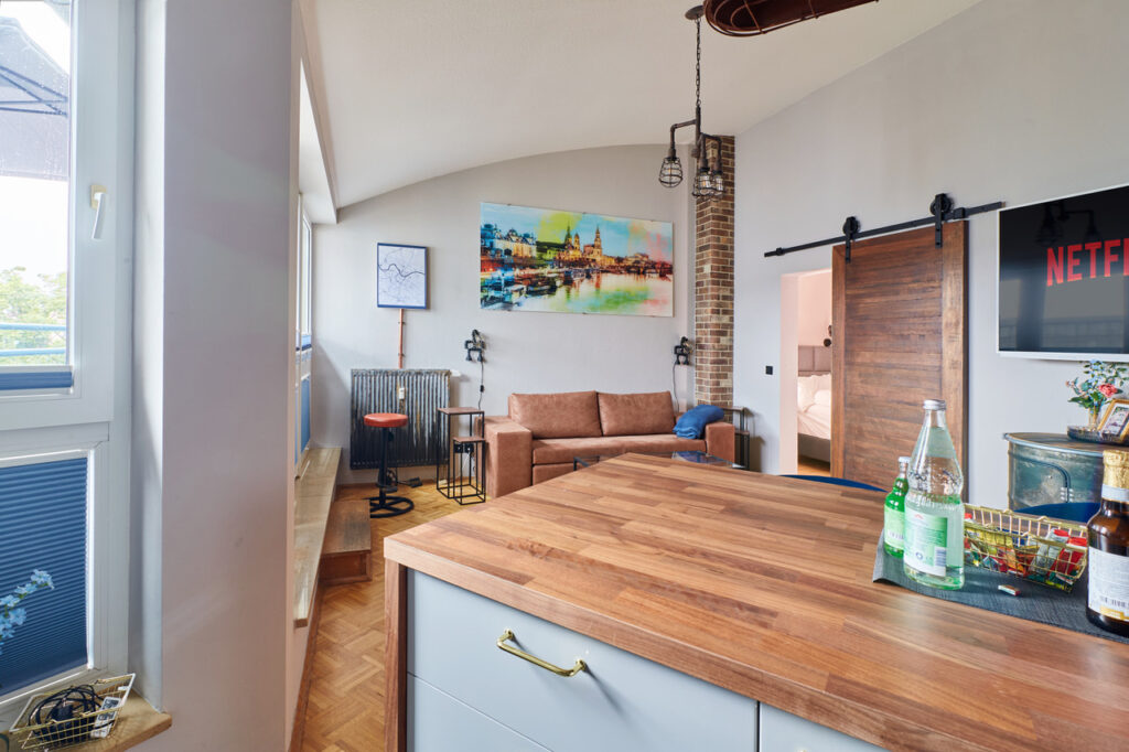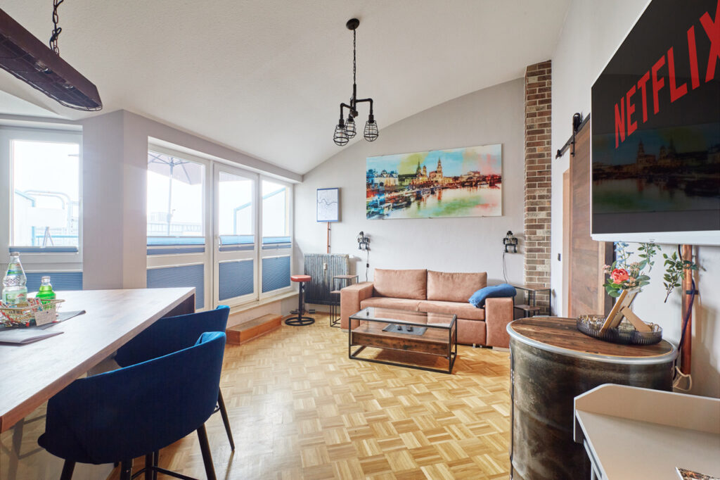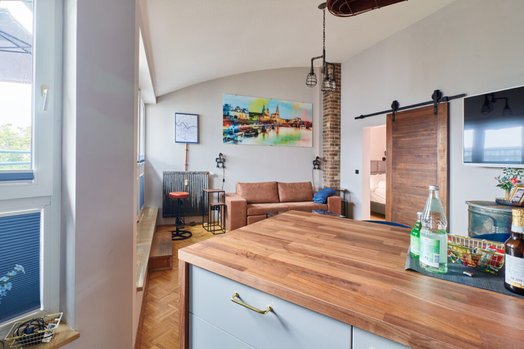 Nel cuore del quartiere Neustadt di Dresda, questo gioiello con ampio balcone ha un fascino da loft. Il mix di elementi in mattoni a vista e stile industriale è maschile ma accogliente. |